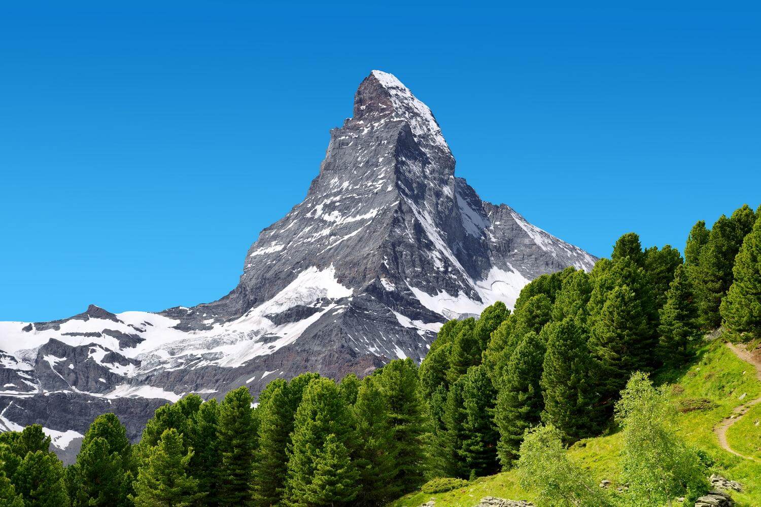 Ünlü Matterhorn dağı, İsviçre Alpleri'nin ikonik bir amblemidir. Dağ, adını Mat anlamına gelen “Mat” yani “çayır” ve “Horn” anlamına gelir. İsviçre ve İtalya arasındaki sınırda yer alan 4,478 metre (14,692 ft) yüksekliğindeki zirvesiyle, Alpler'in en yüksek zirvelerinden biridir.