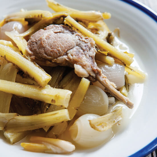 Kuzu etiyle harika olan şevketi bostan yemeğini yerken, limon ve pul biber de eklenir.